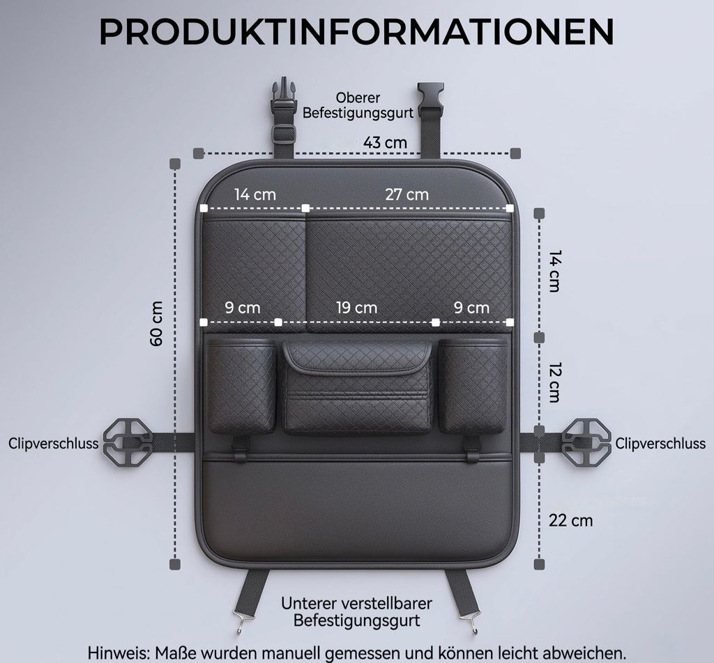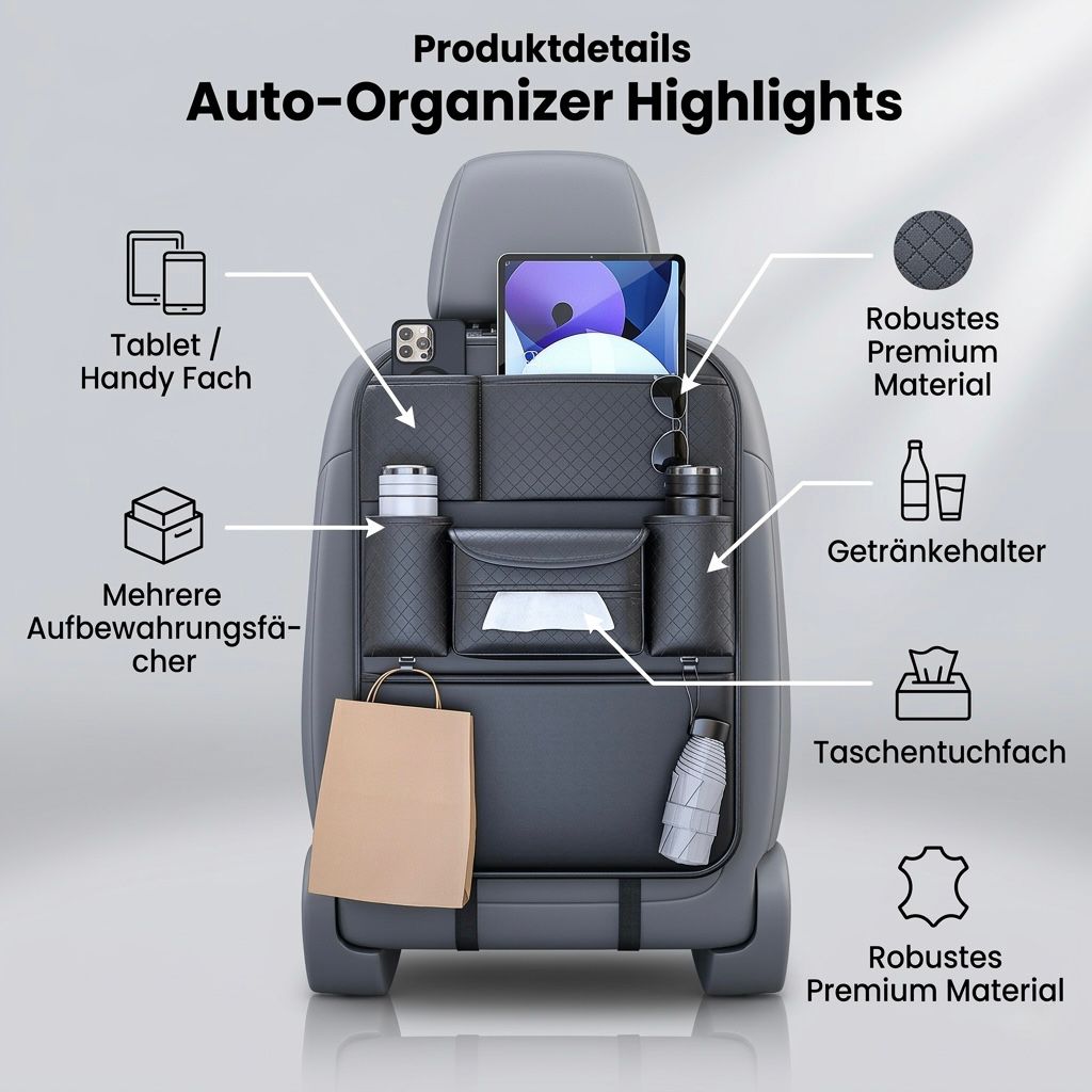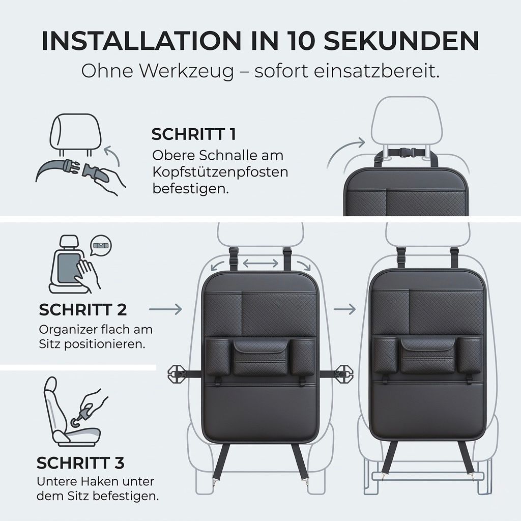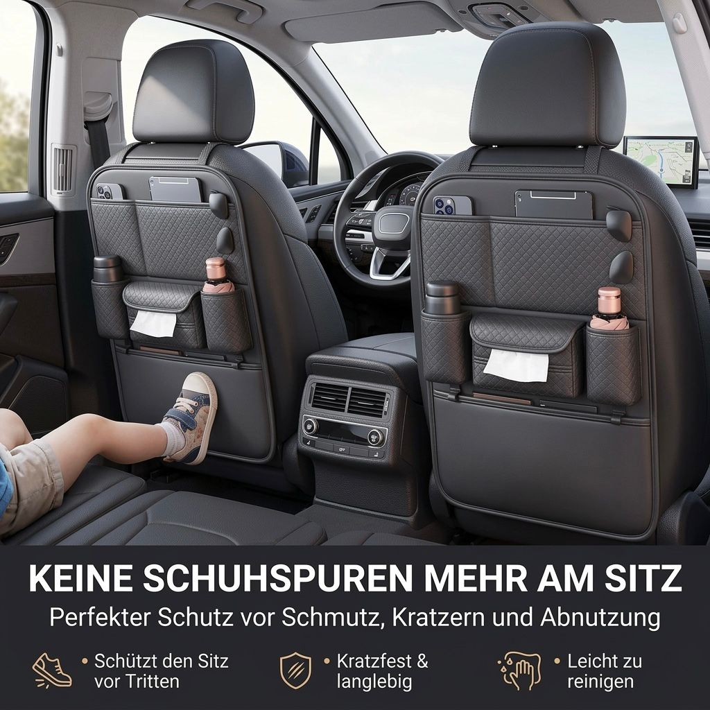 Mit diesem multifunktionalen Autositz-Organizer bleibt Ihr Fahrzeug sauber, strukturiert und geschützt – selbst bei langen Fahrten mit Kindern oder auf Geschäftsreisen.